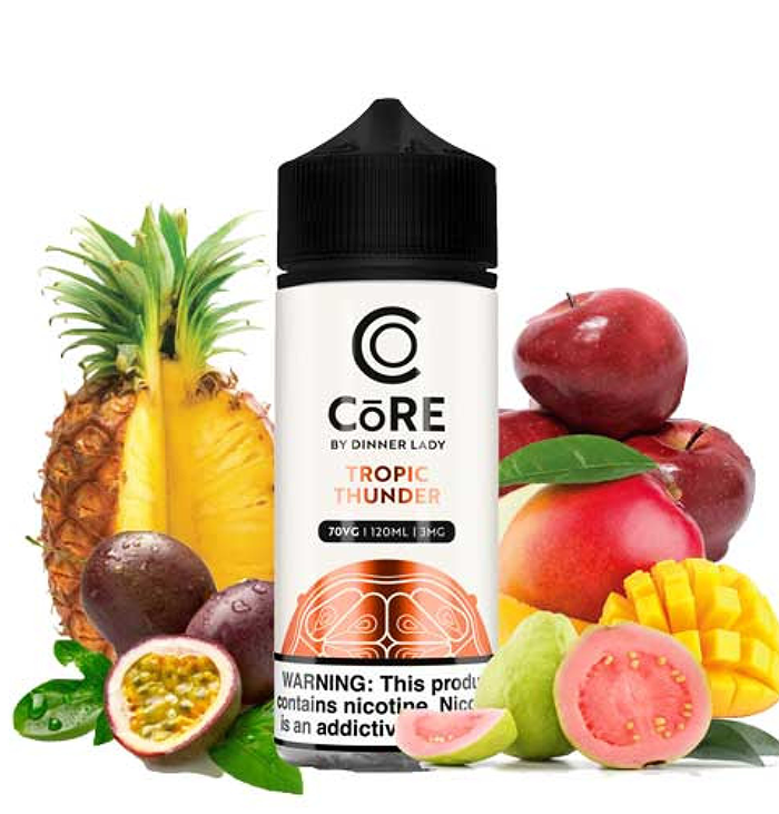 Te invitamos a probar los Dinner Lady Core, en esta oportunidad un delicioso sabor Dinner Lady Core – Tropic Thunder, con una mezcla eléctrica de frutas tropicales, notas de Piña, Mango y Guayaba y notas más suaves de manzana y frutas ácidas con Maracuyá.