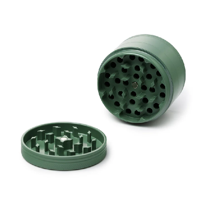 Fabricado en aluminio de grado médico (Human Grade), ofrece alta resistencia, larga durabilidad y un desempeño consistente. Sus dientes en forma de diamante están diseñados para desmenuzar de manera eficiente sin compactar el material. El sistema de cierre magnético asegura un ajuste firme y seguro durante el uso.