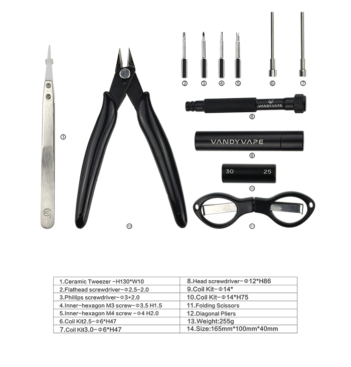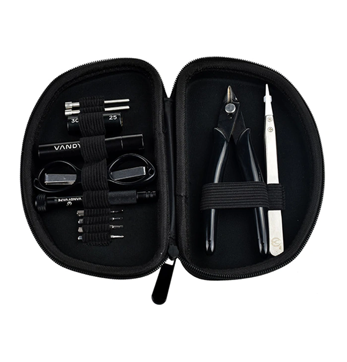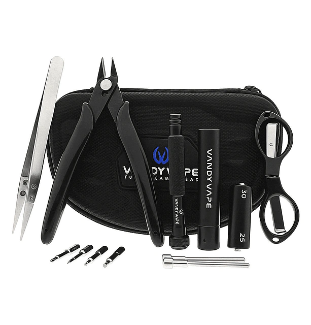 El Vandy Vape Tool Kit Pro Herramientas cuenta con varias de las herramientas esenciales para empezar a reparar tus resistencias RDA y RDTA.